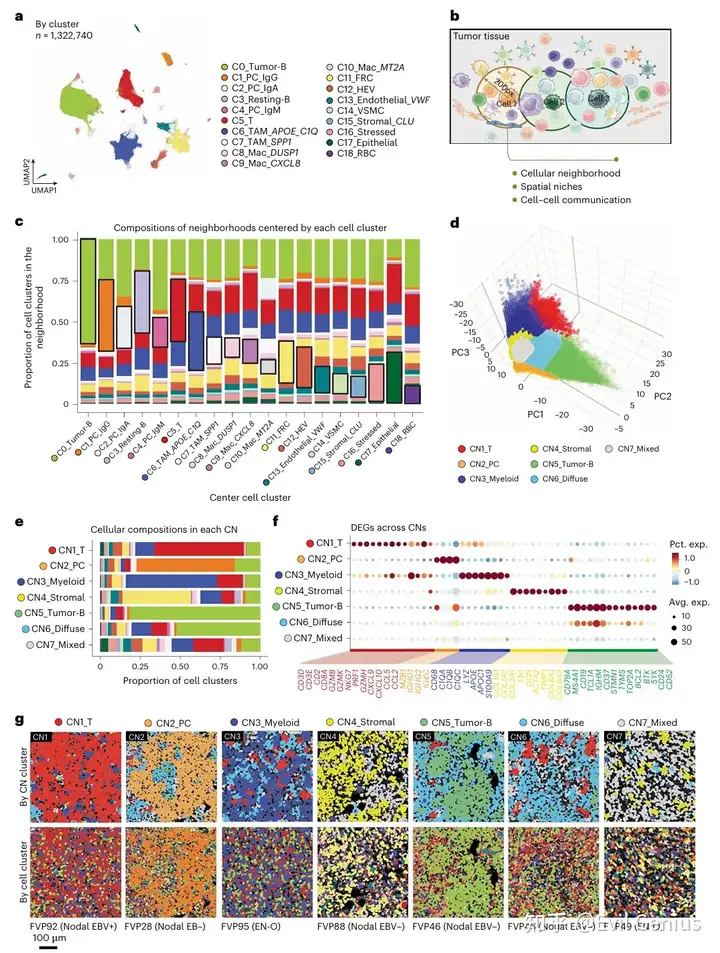 通过对细胞邻域进行聚类,鉴定出七种典型的细胞生态位,分别以T细胞、浆细胞、髓系细胞、基质细胞、肿瘤B细胞、弥漫于异质性免疫浸润中的肿瘤细胞,或非恶性细胞与散在肿瘤细胞的混合模式为特征。在CN1至CN5中,主导细胞状态的优势地位体现在其细胞状态特异性的差异表达基因上,而CN6和CN7则显示出反映其多样细胞组成的混合模式。通过正交的CODEX图像验证了CN1-CN5中主要细胞类型的空间聚集。值得注意的是,在弥漫细胞生态位中,肿瘤B细胞形成了共定位网络的中心,表明在该微环境中肿瘤B细胞与多种免疫细胞类型存在接触。