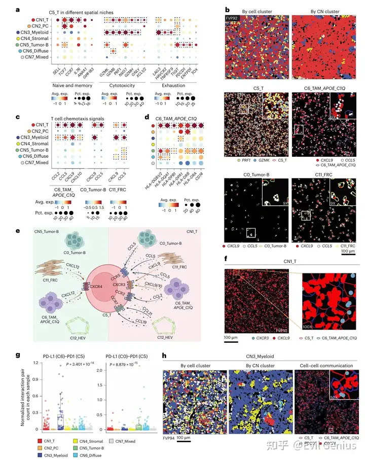 细胞间通讯分析:证实CN1中多种细胞与T细胞间存在丰富的趋化因子-受体相互作用,而其他生态位(尤其是肿瘤生态位)中则缺乏。同时,分析还揭示了: