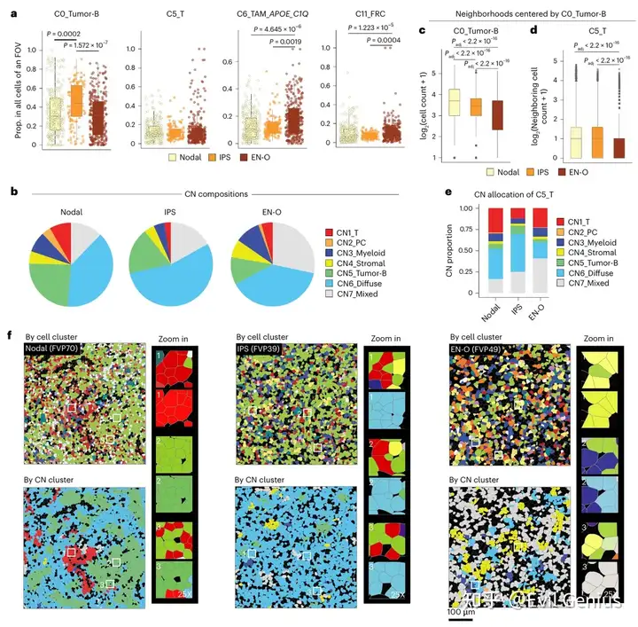 与结节性DLBCL相比,IPS和EN-O DLBCL中肿瘤富集的致密生态位比例更低,而肿瘤与免疫细胞混合的弥漫生态位和混合生态位比例更高。
