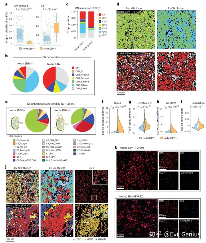 :在排除了生态位差异的混淆因素后,专门比较T细胞生态位内的T细胞发现:尽管EBV阴性DLBCL中该生态位内的T细胞表现为低耗竭标志物表达的健康状态,但EBV阳性DLBCL中同一生态位内的T细胞,其细胞毒性标志物和耗竭标志物的表达均显著上调。单分子分辨率成像和蛋白染色均清晰显示,这些T细胞同时高表达效应分子和耗竭标志物。