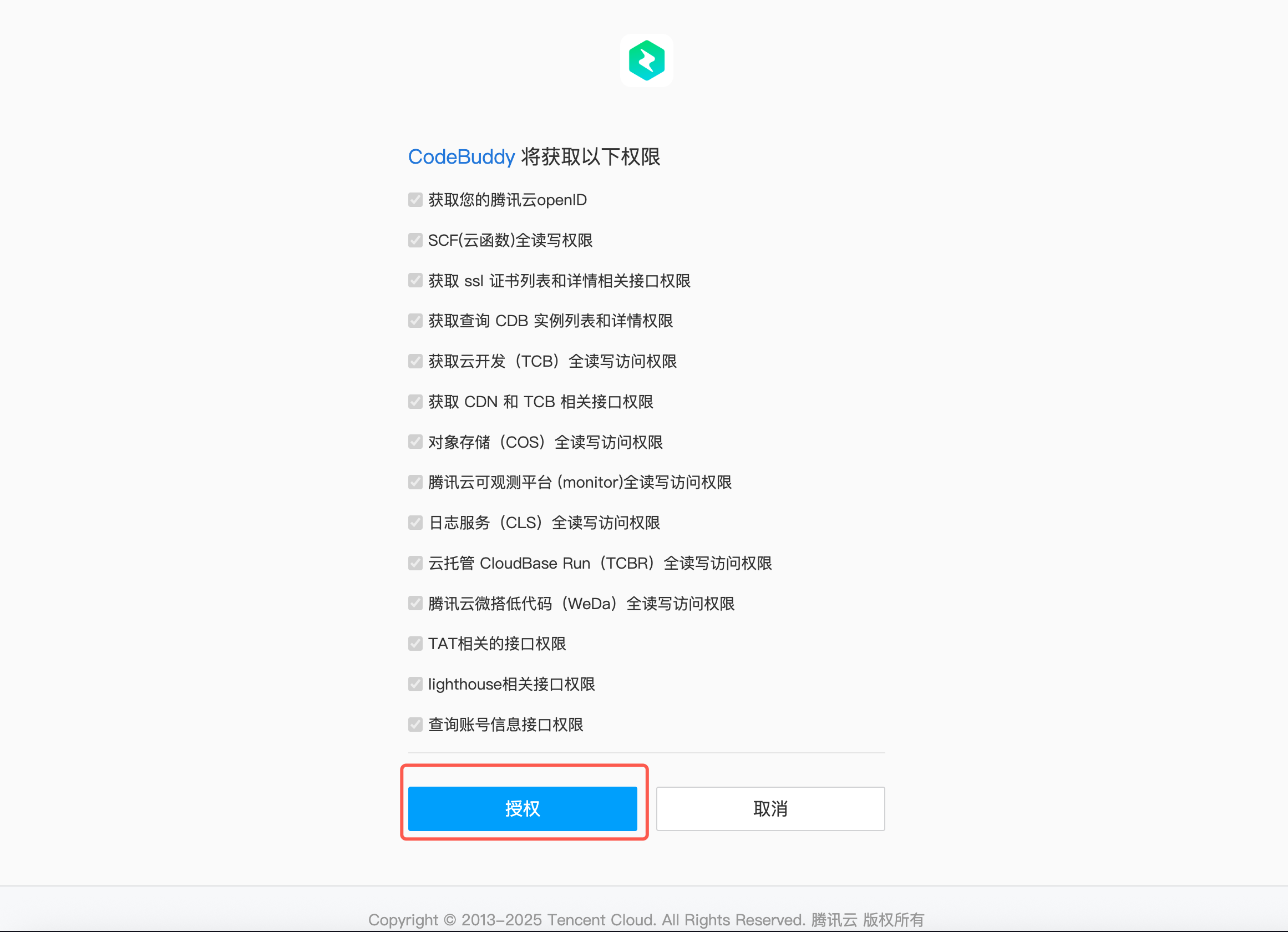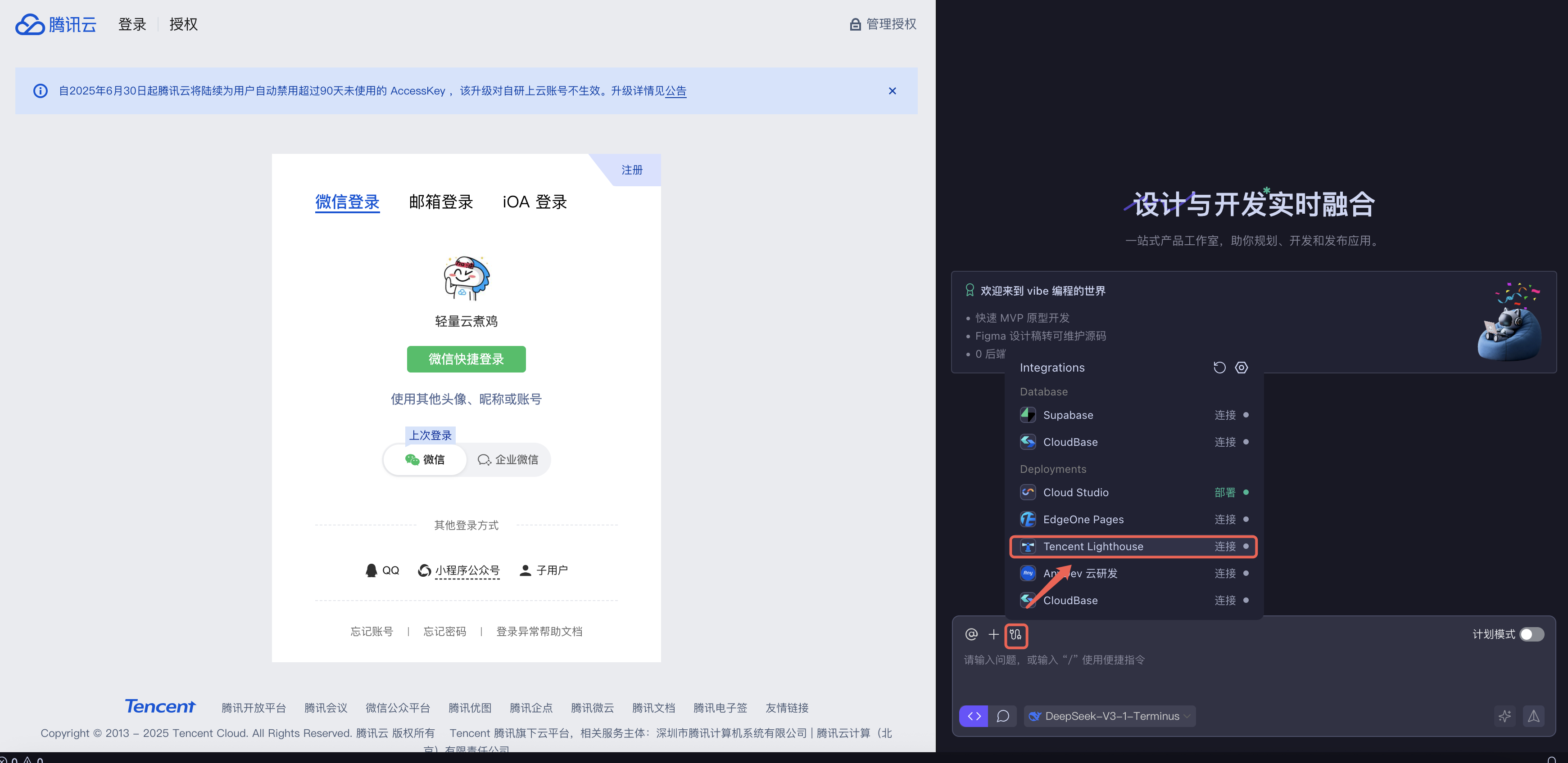 单击CodeBuddy的“配置集成”按钮,选择“Tencent Lighthouse”,在左侧完成账号登录与授权