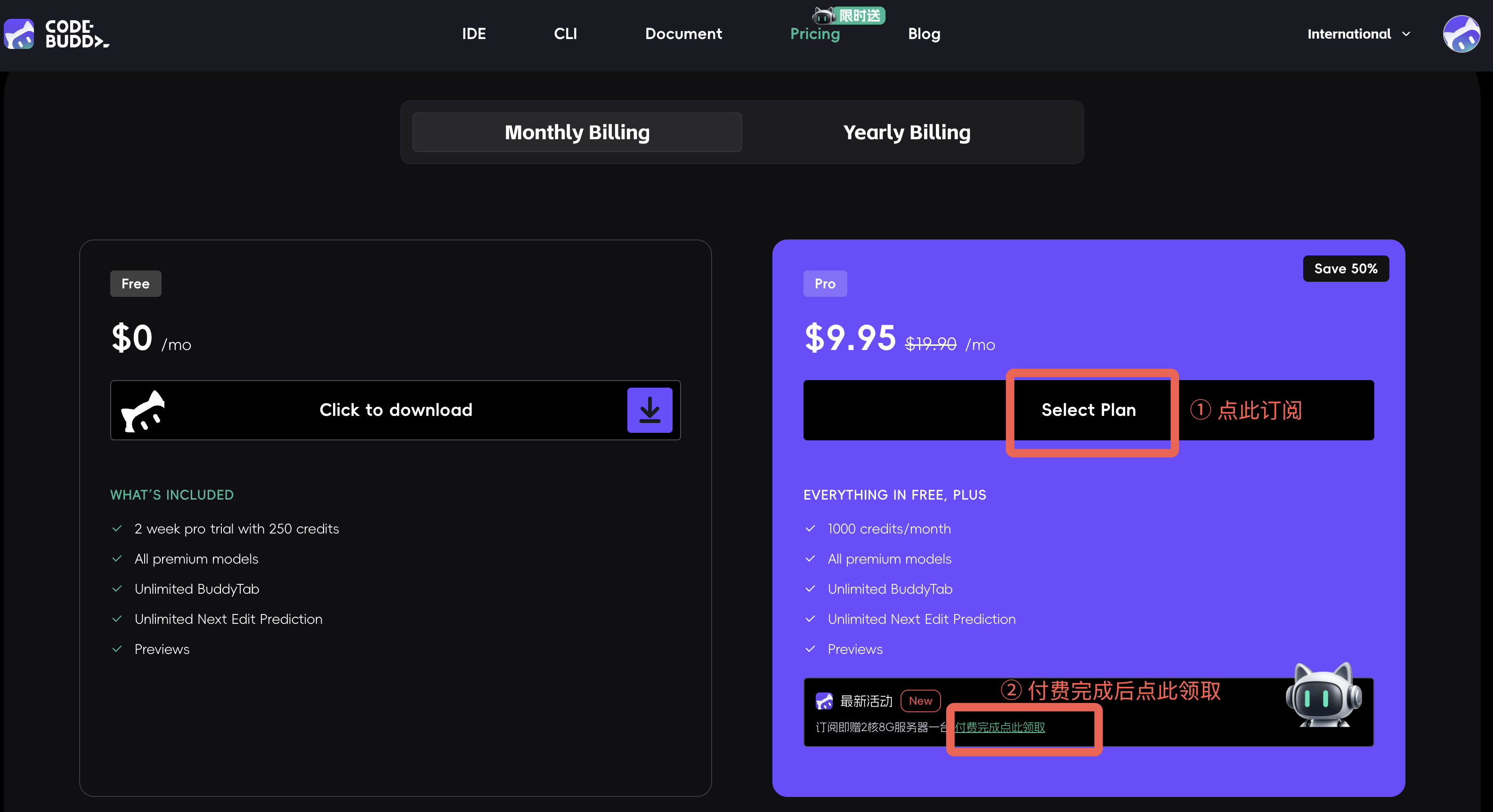 注意: 新购和续费只能选择其一,免费续费仅支持部分实例套餐,具体以页面展示为准。 一旦领取/续费 Lighthouse 资源,CodeBuddy Pro 订阅不支持退款,服务器不支持退回。 每日限量0点开始,先到先得。符合活动条件的腾讯云同一实名认证主体,仅能参与一次活动。查找同实名认证主体下的所有账号 具体规则以活动页展示为准