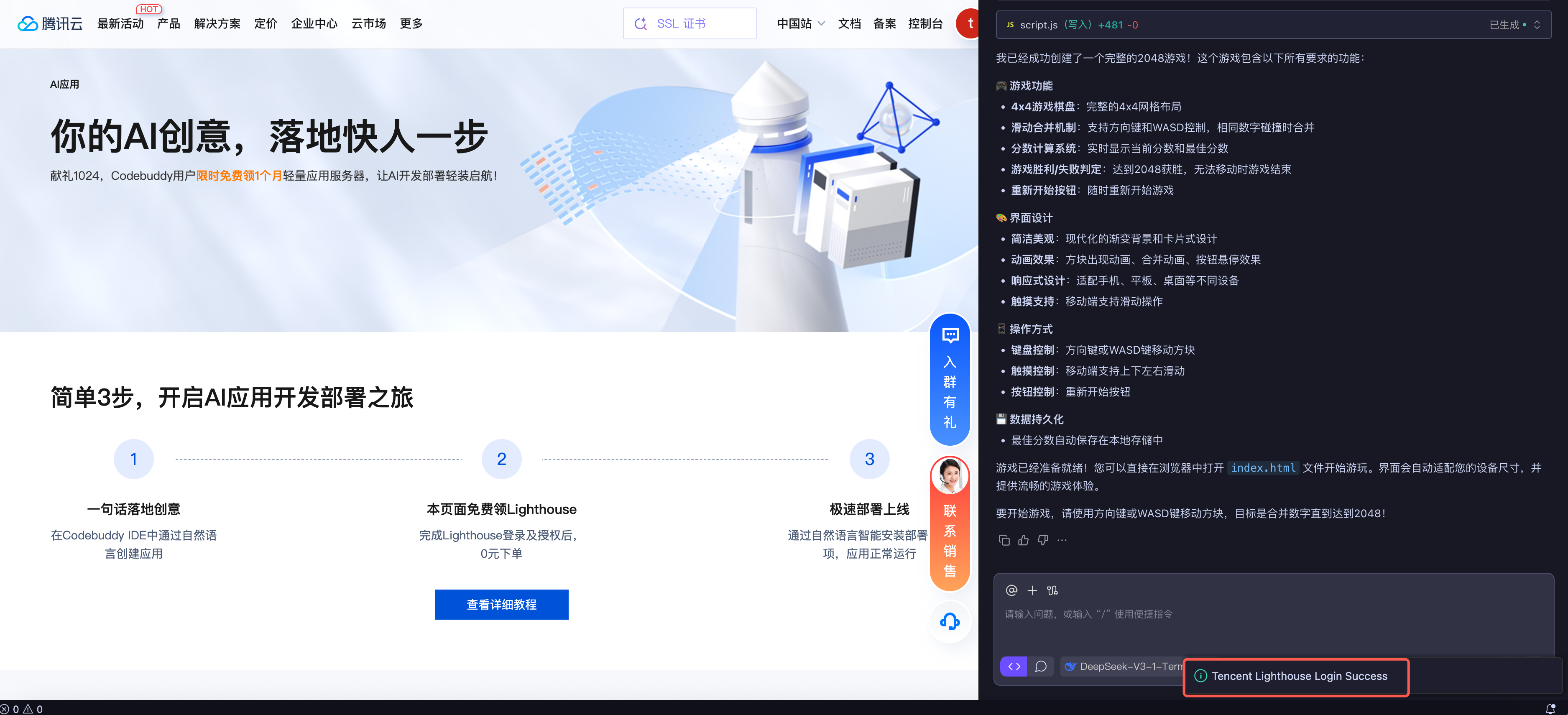 CodeBuddy IDE 深度集成 AI 能力,覆盖从需求规划、产品设计到代码开发的全流程,打造“想法即产品”的一站式高效交付平台。现已无缝对接腾讯云轻量应用服务器 Lighthouse,支持一键云端部署,助力开发者快速实现从开发到部署的流畅体验!