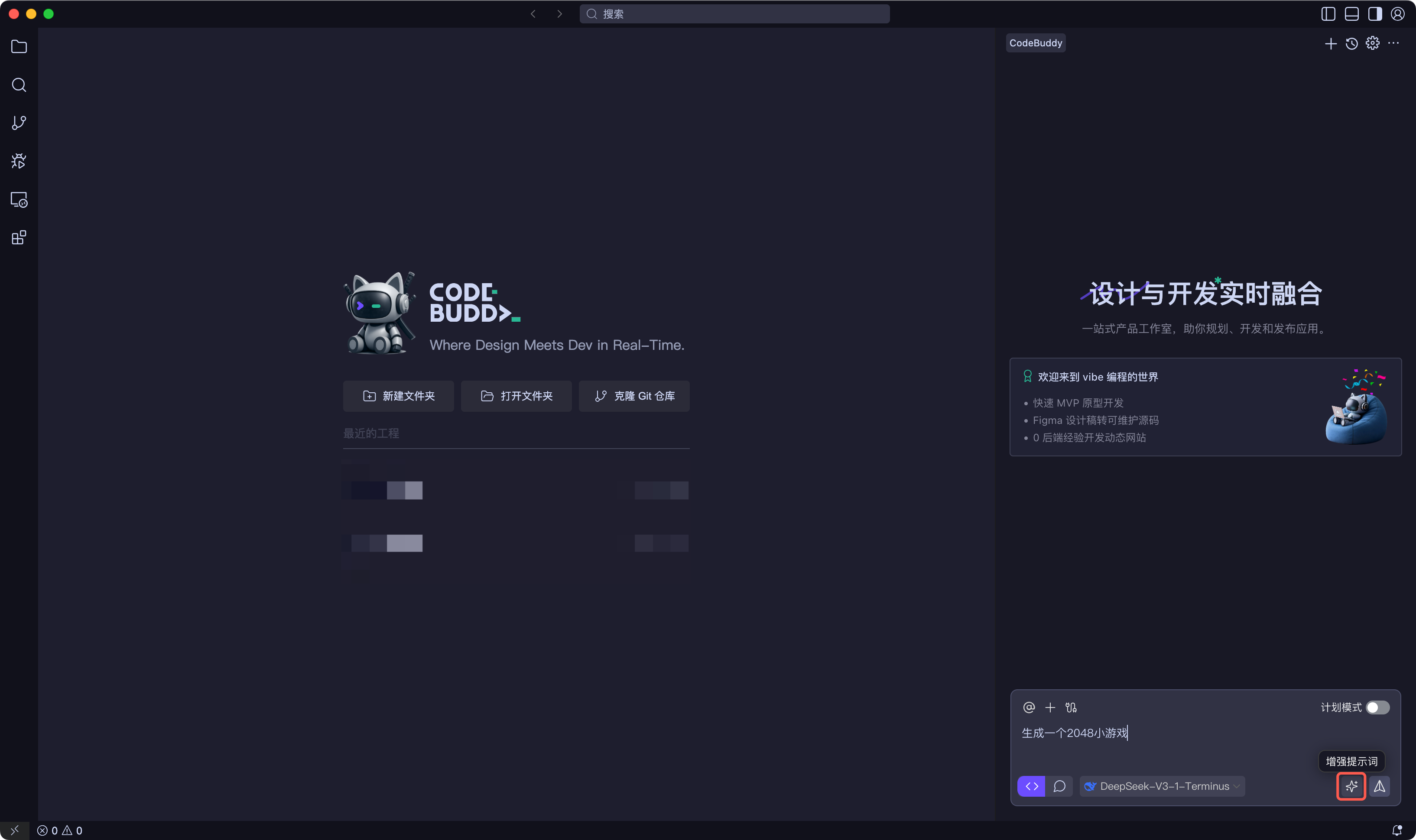 在右侧的对话框中输入“生成一个2048小游戏”,然后单击“增强提示词”按钮,即可对你的想法进行完善和补充,如下图所示: