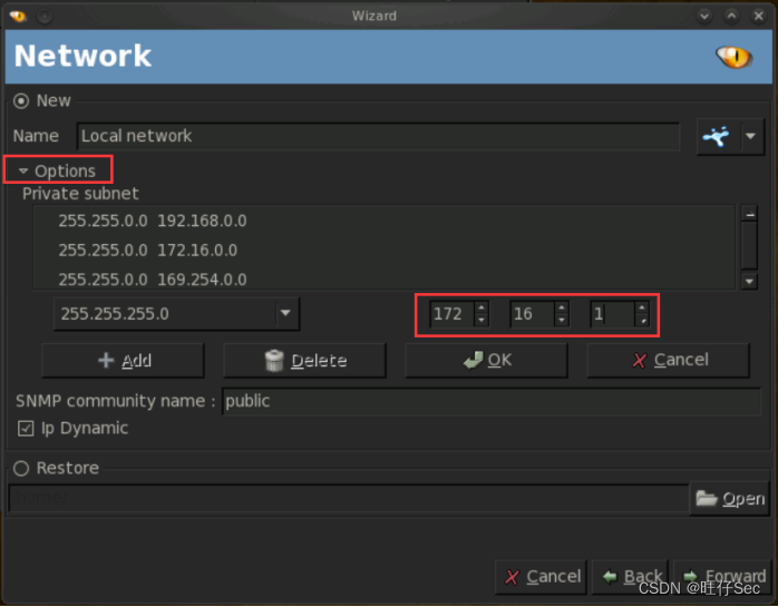 根据导航栏的提示,首先点击Options按钮,下拉找到局域网段,如果不存在点击Add来添加要扫描的网段,后选择24位掩码即255.255.255.0,然后在后面的表格中填入172.16.1.0(根据实际网络情况来进行填写),然后点击Forward继续下一步
