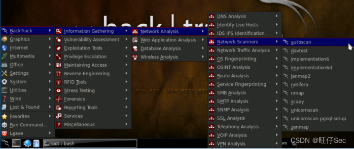 点击桌面左下角菜单按钮依次打开BackTrack——Informatica Gathering——Network Analysis——Network Scanners——autoscan