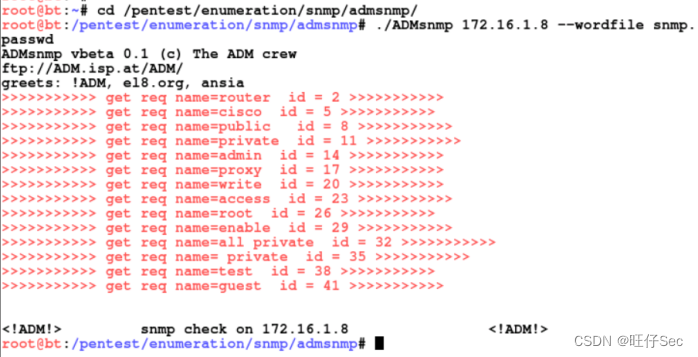 然后使用命令./ADMsnmp 172.16.1.8 -wordfile snmp.passwd