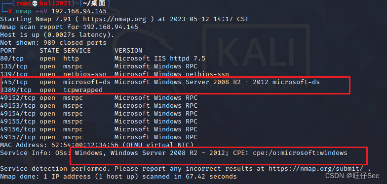通过使用nmap -sV扫描靶机信息发现靶机为windows Server2008版本并且开放了445(SMB)端口
