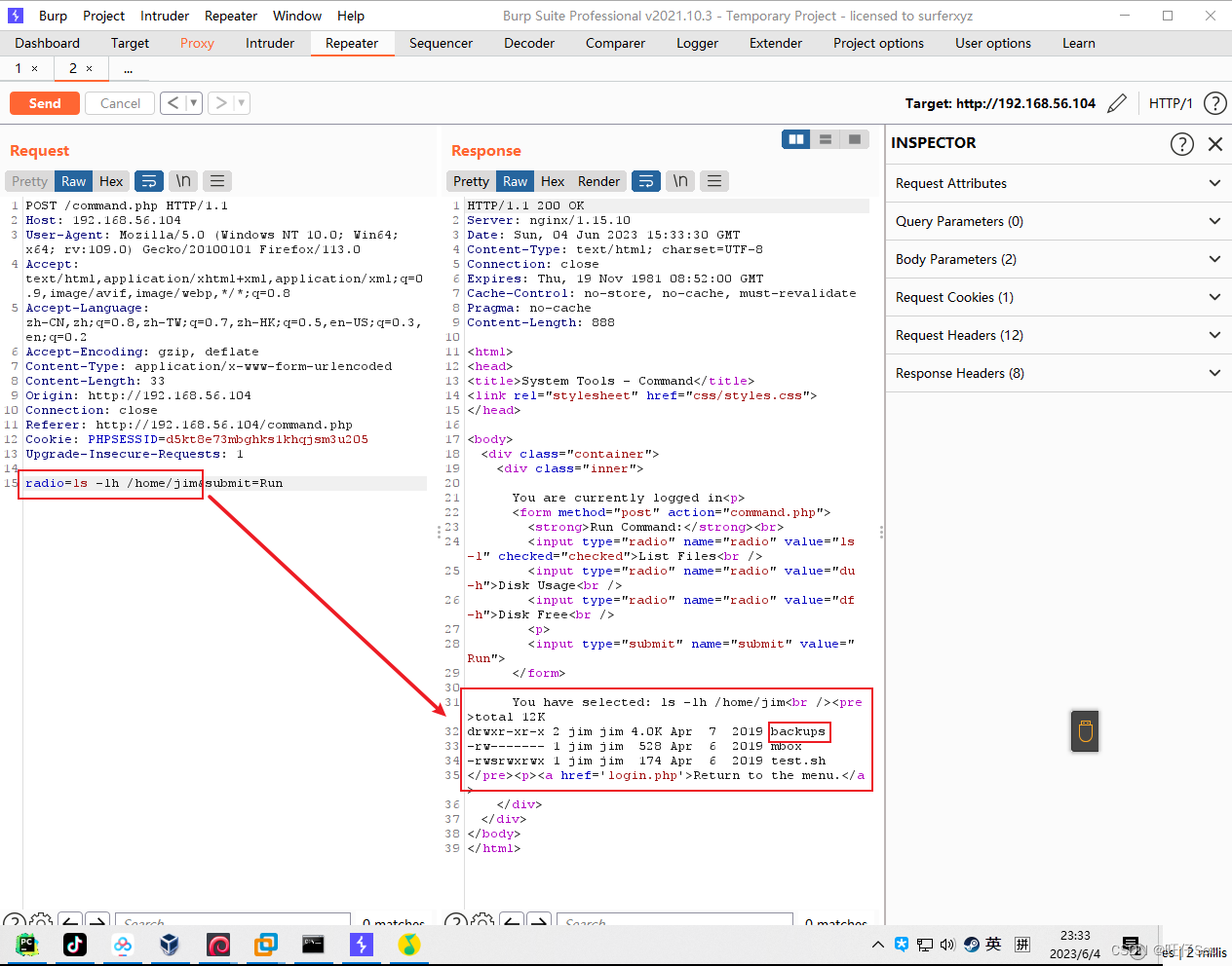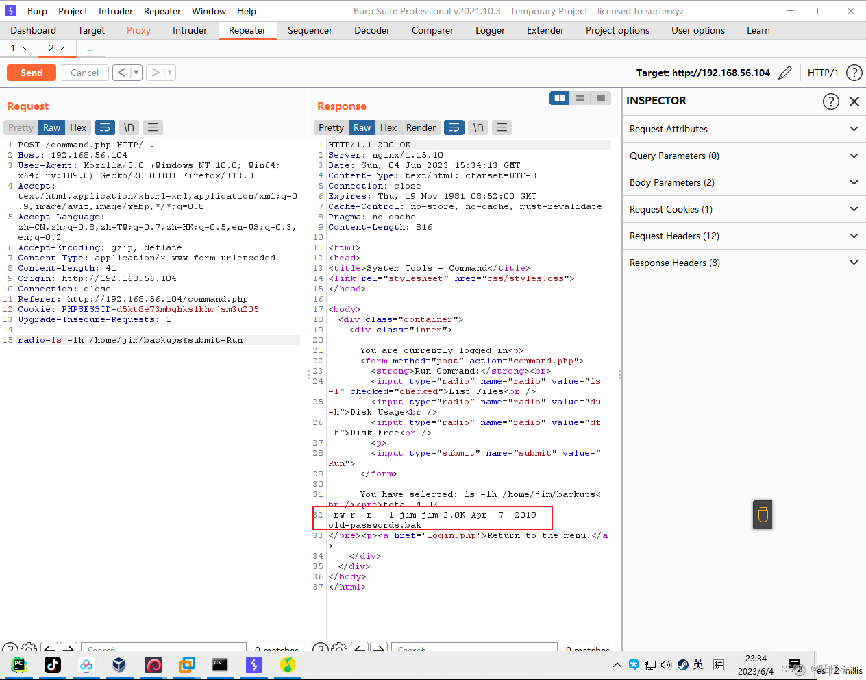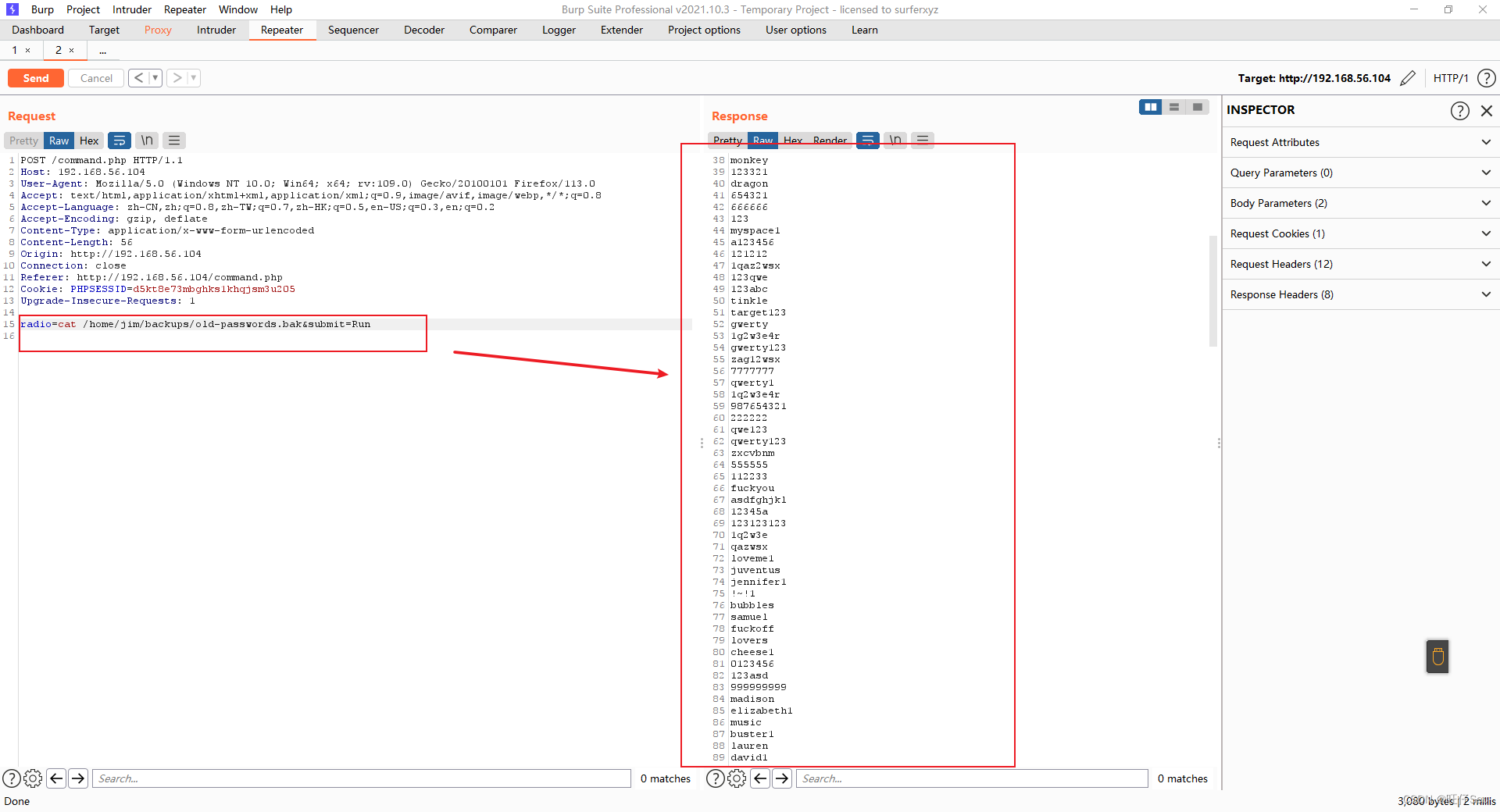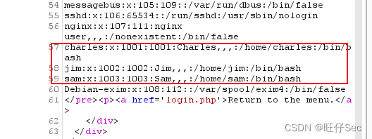 5、在radio后面添加cat /etc/passwd执行,然后看到家目录有三个用户:charles、jim、sam