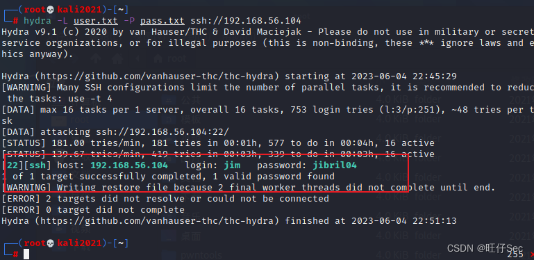10、使用九头蛇进行爆破ssh端口的用户名和密码,爆破出用户名为jim,密码为jibril04