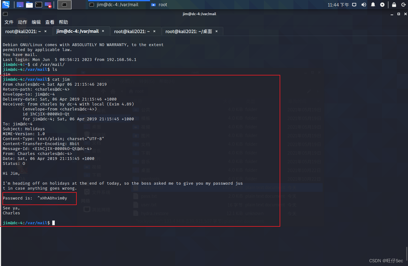 11、使用ssh连接jim用户,然后登录进来发现最后一段是说有一份邮件,那我们可以到/var/mail/目录下看看