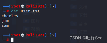9、把密码复制出来然后作为pass.txt字典,然后用户名就是刚刚那三个用户作为user.txt来爆破靶机ssh端口的用户名和密码