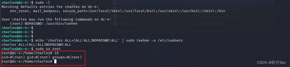 echo 'charles ALL=(ALL:ALL) NOPASSWD:ALL' | sudo teehee -a /etc/sudoers这句话的意思是将charles用户赋予执行sudo的权限添加到/etc/sudoers里。 | 是管道符 将前面的输出添加到后面 sudo teehee -a 是用管理员权限使用teehee -a命令 teehee -a 是添加一条语句到 /etc/sudoers里 /etc/sudoers 里存着的用户都有执行sudo的权限。