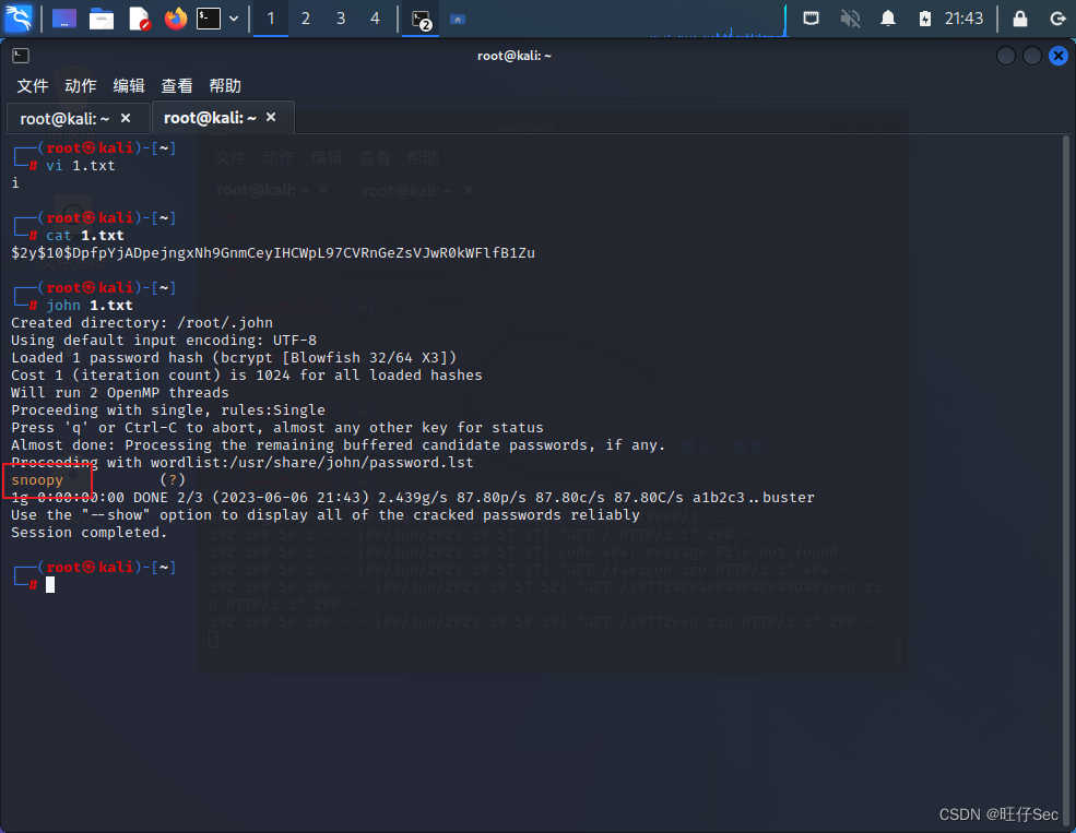 直接把密码复制到1.txt中,用john爆破得到密码:snoopy