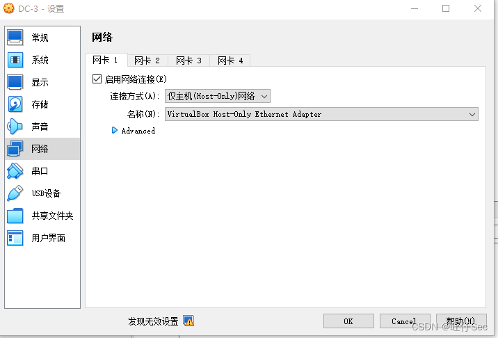 设置一下网卡模式,我这里用的是仅主机模式