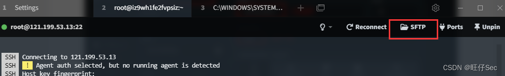 这款终端工具是自带 SFTP 功能的。要使用的话,直接点击下图中的 SFTP 图标就行