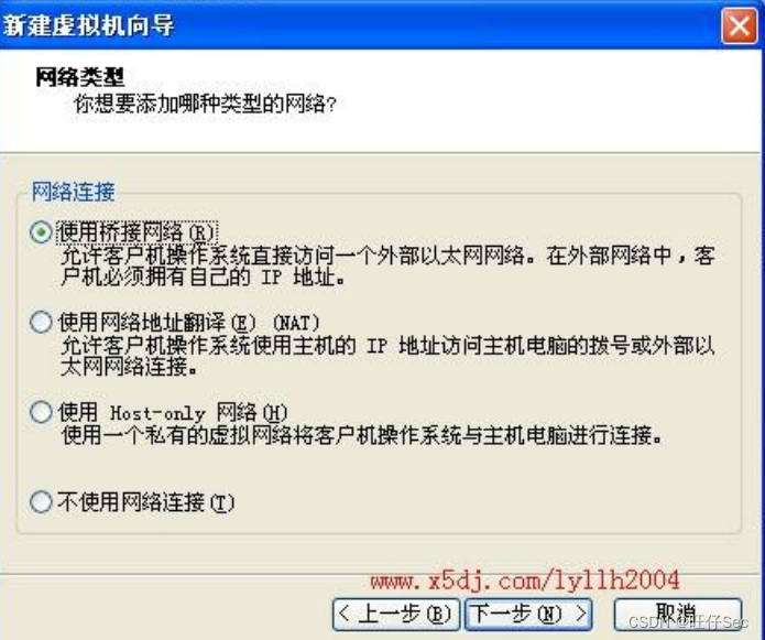 虚拟机选择“桥接”,桥接之后便可以直接上网了,但是不能和主机共享资料,所以我采用“共享”的方式,使得虚拟机共享主机网卡,从而达到上网和共享主机资料的目的。