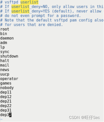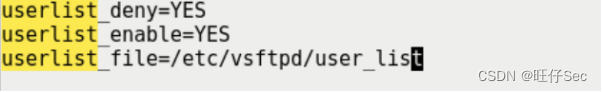 配置VSFTP,开启userlist功能。在配置文件增加下图的三行内容