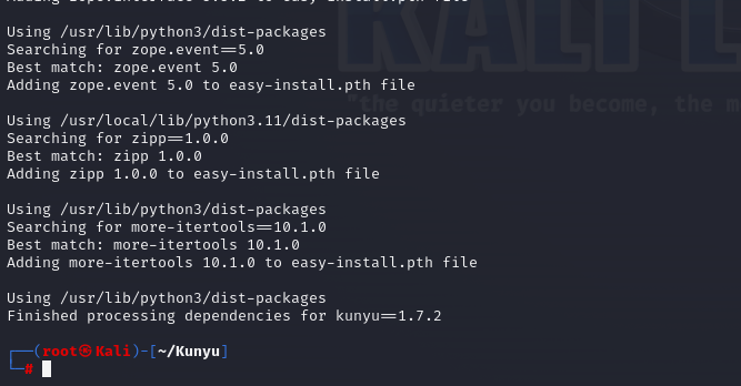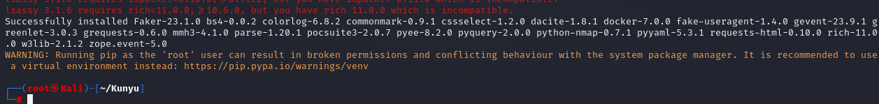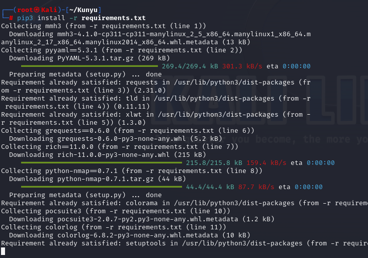 出现Successfully installed Faker-23.1.0 bs4-0.0.2 colorlog-6.8.2 commonmark-0.9.1 cssselect-1.2.0 dacite-1.8.1 docker-7.0.0 fake-useragent-1.4.0 gevent-23.9.1 greenlet-3.0.3 grequests-0.6.0 mmh3-4.1.0 parse-1.20.1 pocsuite3-2.0.7 pyee-8.2.0 pyquery-2.0.0 python-nmap-0.7.1 pyyaml-5.3.1 requests-html-0.10.0 rich-11.0.0 w3lib-2.1.2 zope.event-5.0即安装成功