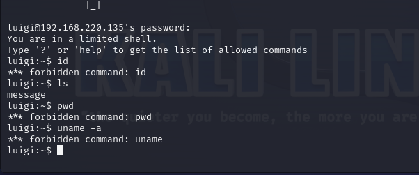 但是通过ssh连接之后发现没有什么执行命令的权限,是一个需要提权的状态。
