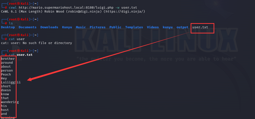 使用cewl爬取http://mario.supermariohost.local:8180/luigi.php站点下的可疑用户名作为用户名字典