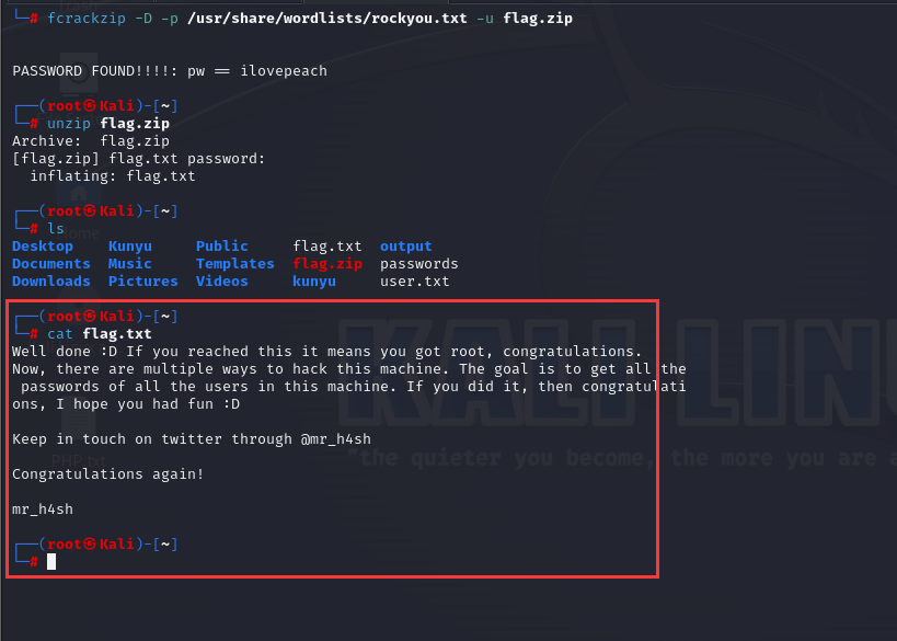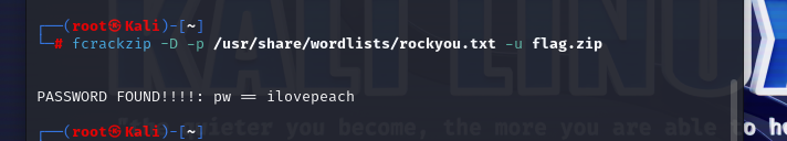 bashCopy Codefcrackzip -v -D -p /path/to/dictionary.txt encrypted.zipbashCopy Codefcrackzip -v -c 'aA1!' -l 1-6 encrypted.zipfcrackzip -D -p /usr/share/wordlists/rockyou.txt -u flag.zip爆破得出密码 ilovepeach