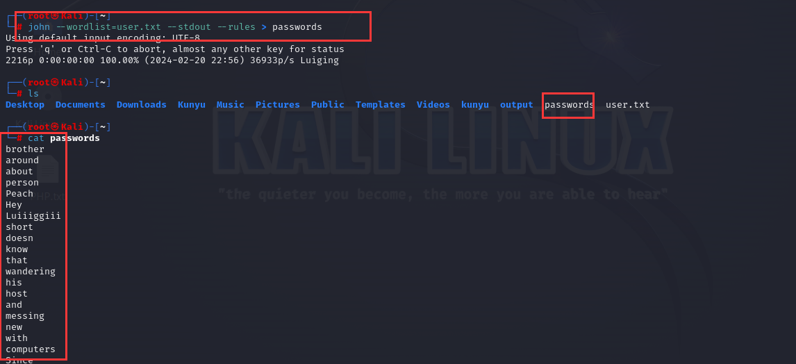 这个命令的作用是使用 john 工具从名为 user.txt 的字典文件中应用密码破解规则,并将结果输出到文件 passwords 中。 具体而言,这个命令的各部分含义如下:
