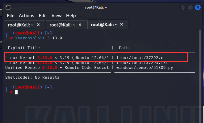 提权之后查看系统内核版本,发现是一个3.13.0的内核,所以我们可以searchsploit中查找到了一个37292.c的c文件