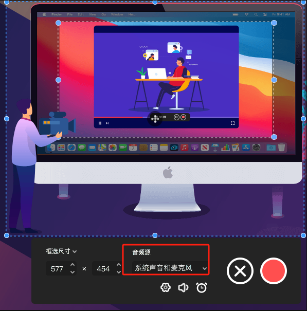第三步:确认音频来源,比如可选择录制系统声音和麦克风。