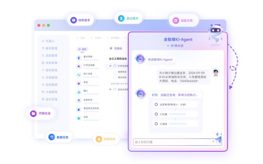 与其他厂商侧重单一领域不同,金智维的Ki-AgentS强调开放架构与人机协同的安全可控:通过MCP/A2A协议无缝集成RPA服务,一键升级现有流程为智能体工具,支持复杂业务调度;内置20+企业级插件和行业深度组件(如金融风控、合规审计),覆盖银行、证券、保险等多领域。构建方式多样,IT人员通过低门槛流程编排开发,业务人员利用聊天式交互自动生成智能体,确保零代码高效落地。其沉浸式交互设计支持执行实时可视化、回溯可查,用户可随时介入指导,并在登录验证等场景自动转交人工,确保合规与安全性。