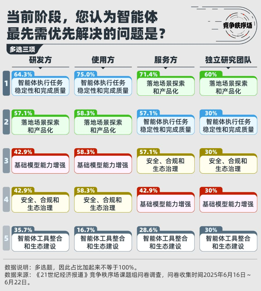 这些门槛正是金融机构日常痛点的真实写照。一份来自《21世纪经济报道》的调查报告显示,超过七成的证券和保险机构将“提升效率”和“风控”视为引入智能体的核心诉求,而银行和信托机构则更注重“降低成本”和“服务优化”(占比均超四成)。这种跨机构的诉求差异,正折射出智能体落地过程中的多维挑战:效率提升离不开数据壁垒的突破,风控强化考验合规边界的把控,而成本控制和服务升级则呼应着人力结构的悄然转型。面对这些交织的难题,机构们越来越意识到,单一智能体难以成事,唯有转向平台化部署,才能将散乱的需求织成一张可管理、可监控的网,实现真正跨场景的规模化落地。