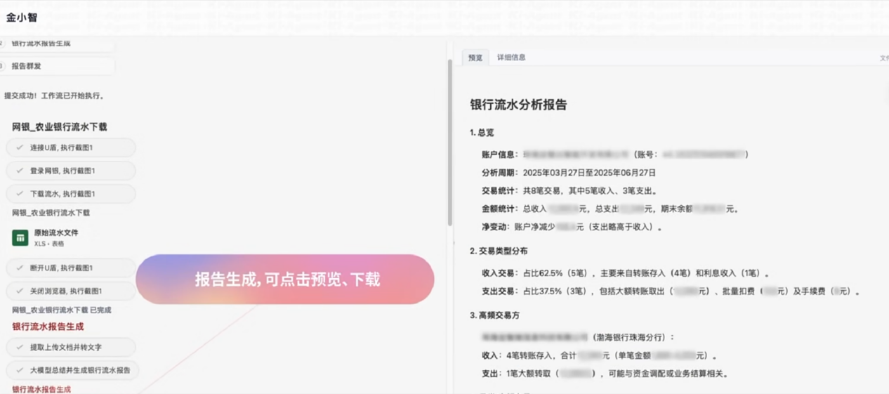 以银行流水分析为例,用户简单指令即可端到端自动化网银登录、数据提取、解析与报告分发,将1小时以上核查压缩至8分钟,生成可追溯报告并定向推送,帮助财务人员聚焦高价值决策。在债券报告分析中,智能体平台融合大模型语义理解与RPA操控,在数分钟内从数百页面提取关键要素(如担保措施、偿债计划),生成逻辑严谨的评估报告,效率提升90%以上,全程留痕满足合规要求。类似的,在券商舆情监测中,智能体实时聚合数据、生成初稿分析,显著缩短投研周期。 不同厂商路径的背后,是对“智能体该如何与金融系统深度融合”的不同理解。从结果上看,智能体的介入正让金融业务从外围辅助走向核心执行。