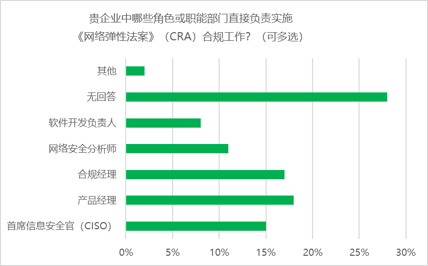 具体负责的角色也呈现类似的分散态势。在审视负责任的角色时,也出现了类似的分散情况。18% 的企业将 CRA 合规性分配给产品经理,17% 分配给合规经理,15%分配给首席信息安全官(CISO),11% 分配给网络安全分析师,8% 分配给软件开发主管。由此看来,不同团队和角色之间的合规职责很可能存在交叉重叠。