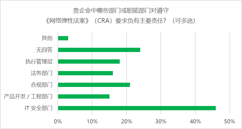 当被问及由谁负责确保符合《网络韧性法案》要求时,各企业的回答呈现显著差异。调查数据显示:46%的企业由IT安全部门主导合规工作;21%由合规部门牵头;16%由法务部门负责。另有18%企业的最高管理层直接主抓此事,15%企业则将职责赋予产品开发部门。由此可见,在大多数情况下,企业很可能通过多部门协同的方式承担CRA合规责任。