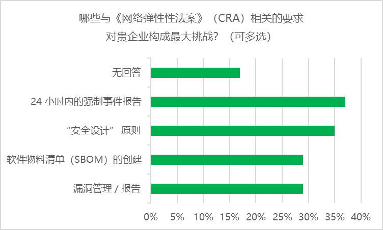 报告显示,CRA要求下企业面临的最大挑战是 “24 小时内报告安全事件” 的义务,其次是遵循“安全设计”和“默认安全”原则;另有 29% 的企业表示,“创建软件物料清单(SBOM),以及由此产生的‘对所有软件组件及其漏洞进行持续监控’的相关要求”,是其主要关切点。