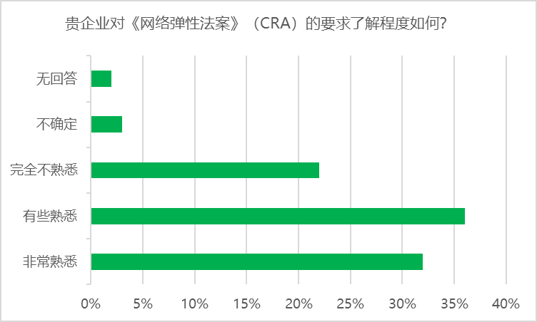 据《2025年物联网和OT网络安全报告》数据显示,只有不到三分之一 (32%) 的企业完全了解CRA的要求;有 36% 的企业曾调查但并未掌握;剩余27%的企业对CRA则是一无所知。