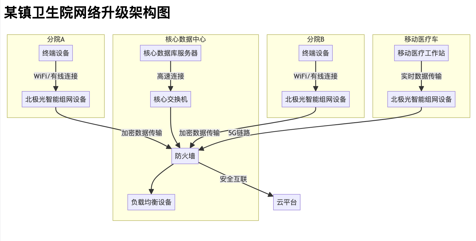 随着医疗行业信息化的不断推进,卫生院机房网络的升级成为提升医疗服务质量和效率的关键一环。以某镇卫生院的网络升级项目为例,其核心工作不仅涵盖硬件设备的采购,还涉及系统集成与网络安全的全面建设。尤其是异地组网作为项目中的关键环节,面临着复杂性与高要求的双重挑战。