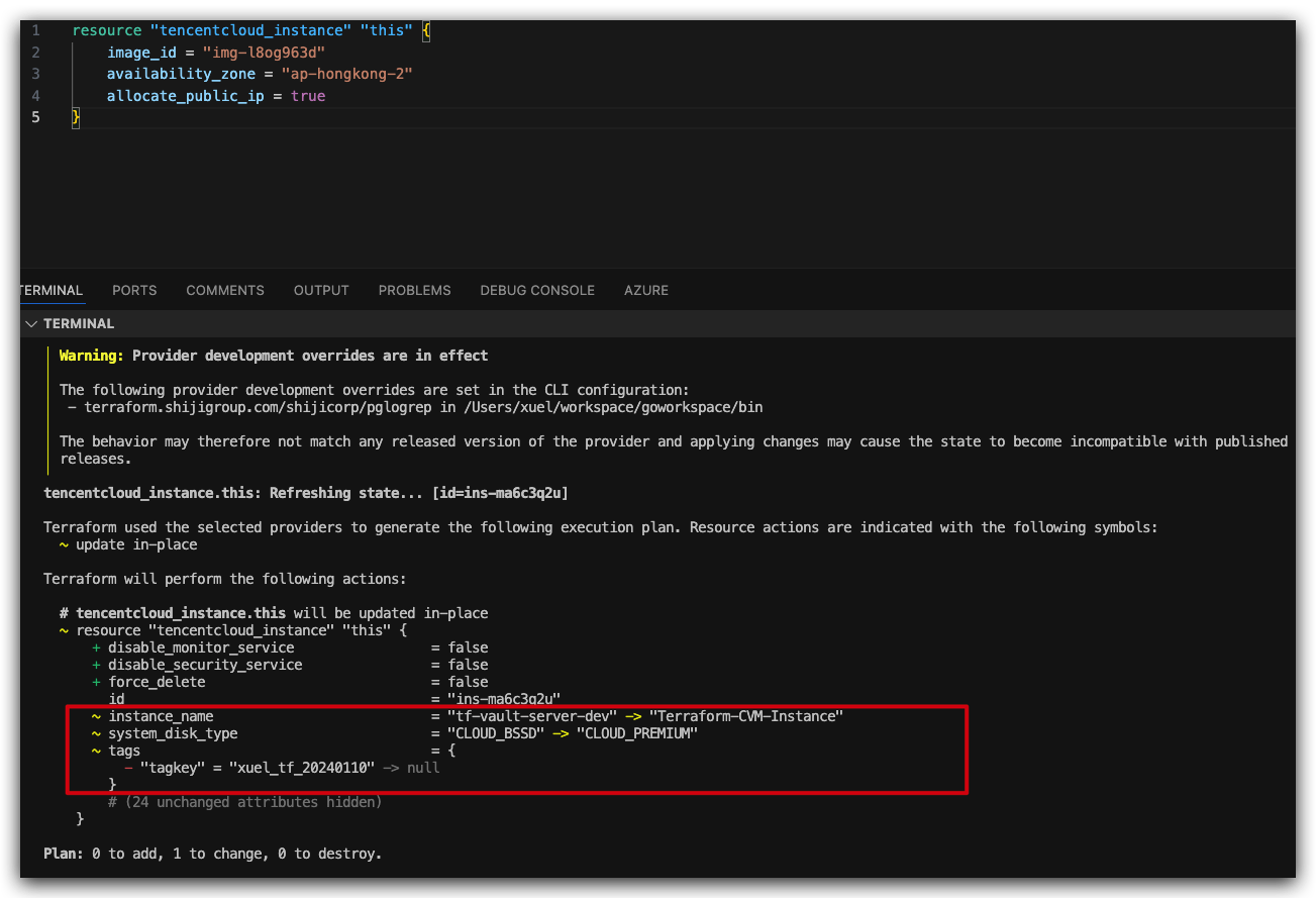 }执行 terraform apply 后,控制台将输出资源 ID(如 ins-ma6c3q2u):