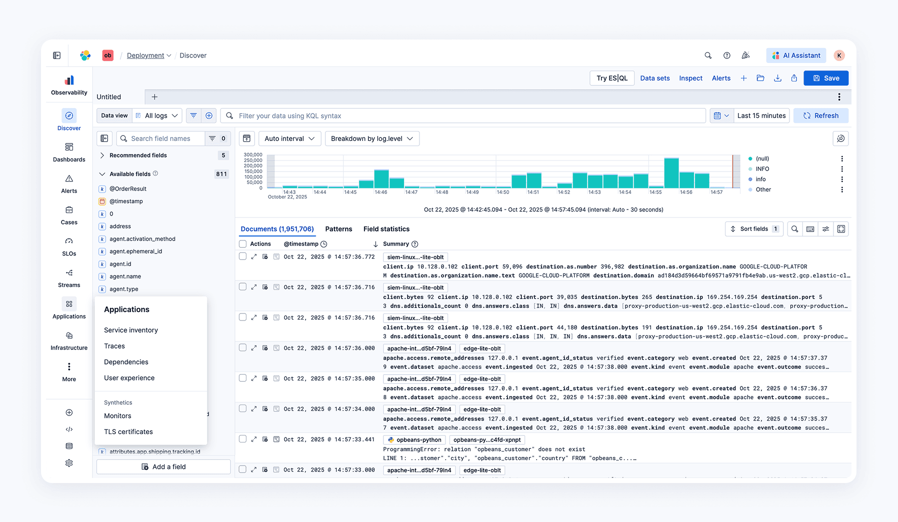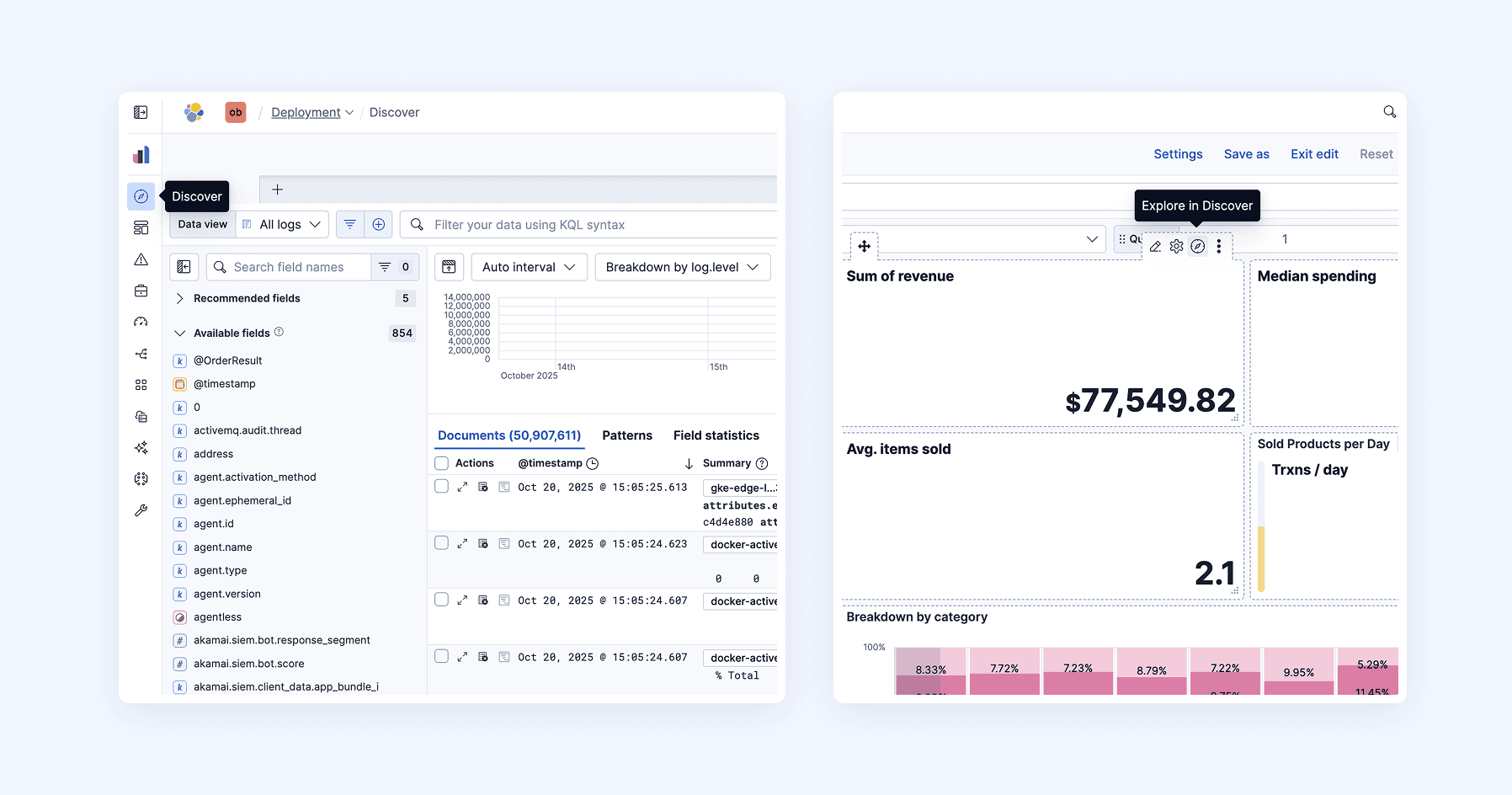 为了实现功能齐全的折叠模式——一个高度请求的功能,我们开发了一个可以缩减为图标列的导航系统。早期用户体验测试表明,这种设计受到了用户的好评。通过将 Kibana 的抽象概念与独特的图标进行视觉关联,导航变得更加直观、易记且高效。例如,Discover 中的 Explore 使用相同的 Discover 图标,使其更易于识别。我们还支持可选的文本标签,在扩展模式下可见,并在折叠时作为工具提示显示。最后,这种方法允许在需要时同时显示两个导航面板——这在以前由于屏幕空间有限而难以实现。