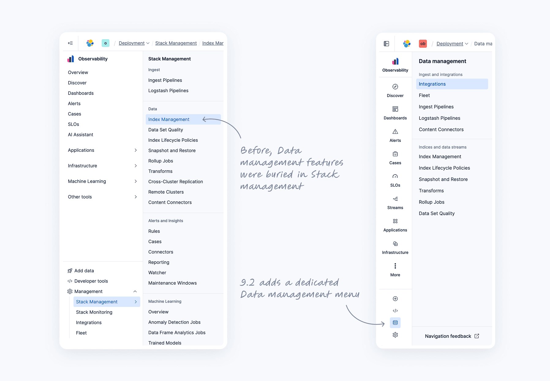 这为管理索引和数据生命周期任务提供了一致的家,能更快地访问与数据相关的页面,而无需通过 Stack Management 导航,并且能更清晰地了解数据管理在 Kibana 中的位置。