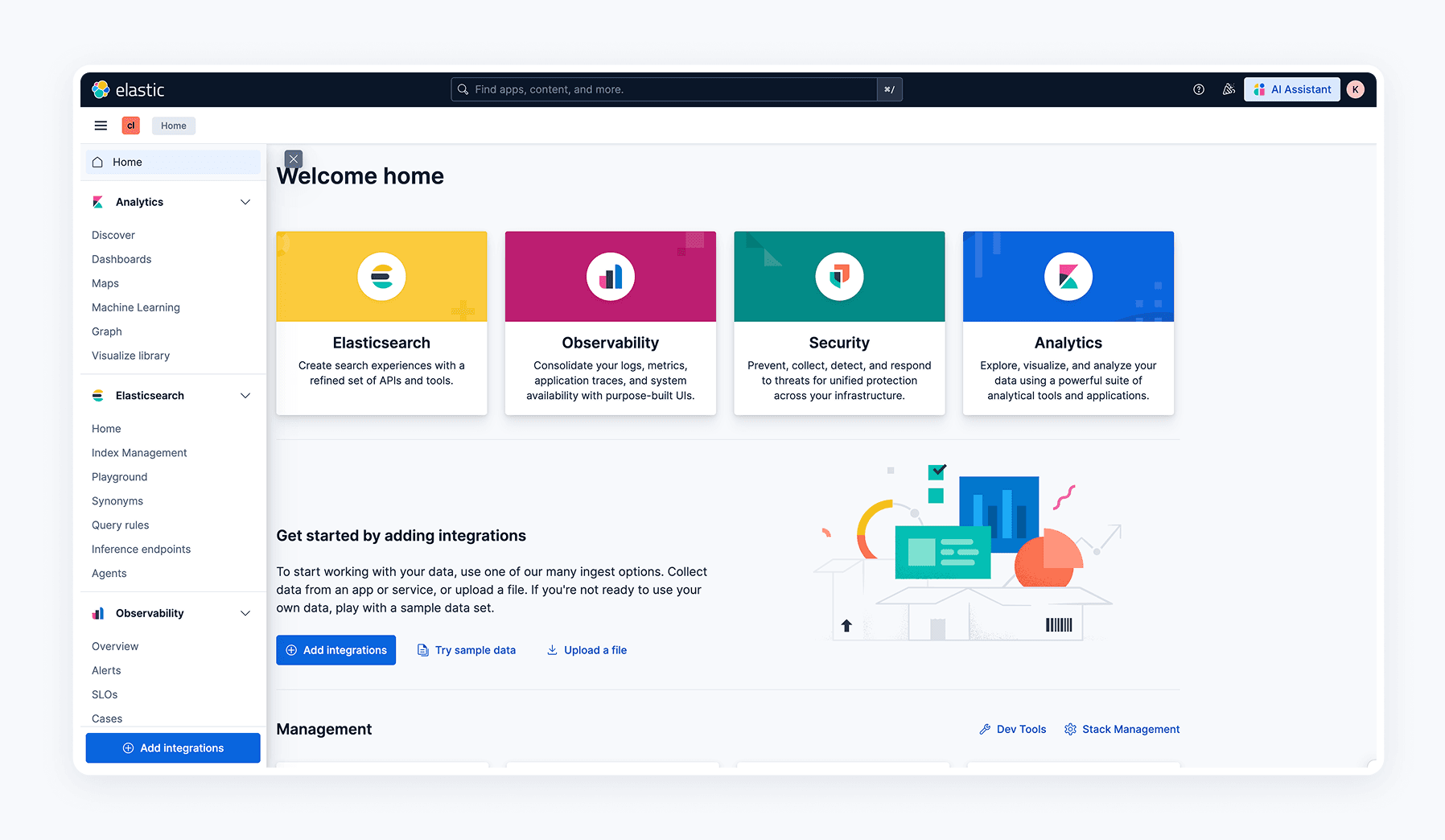 以前,索引管理等页面被埋在 Stack Management 中,难以找到。现在,它们被统一归入一个清晰定义的部分,包括 Fleet、索引管理、集成、数据管道。