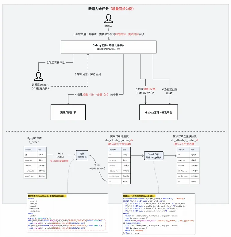 通过工单申请即可实现MySQL数据入仓。自动帮用户创建同步数据源、增/全量ODS表、同步任务、增量Merge任务,并自动赋权以及数据初始化。根据用户调研和埋点分析,每个数据入仓需求可提效30min+。
