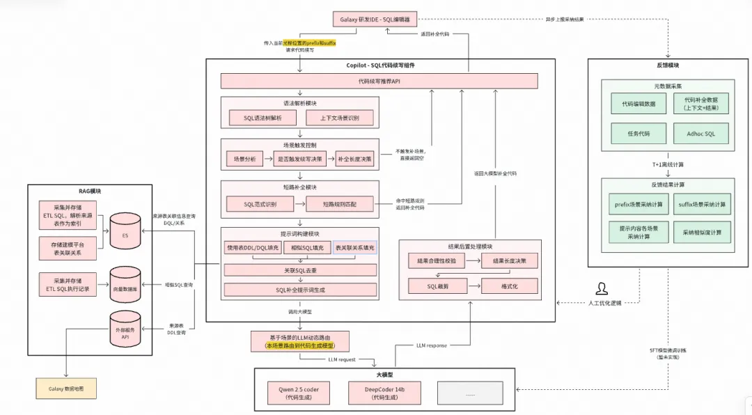 当前我们处于L1的Copilot阶段,通过在数据研发流程中,旁路嵌入基于专家经验规则和大模型的智能SQL代码续写、智能任务诊断、智能SQL代码纠错与优化、 智能质量规则推荐等应用,辅助用户进行高效数据研发。嵌入Copilot后的Galaxy研发平台整体架构如下,主要关注红色部分: