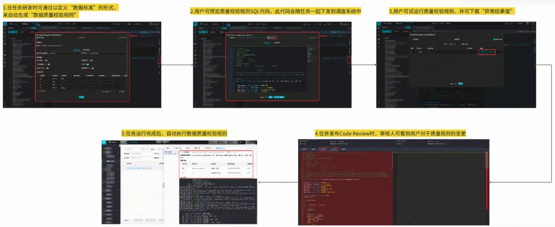 Galaxy数据研发平台已经实现了完善的数据质量规则校验能力,用户在Galaxy数据研发IDE上面向数据标准进行高效的质量规则定义,系统会自动生成校验SQL随着任务的发布一起下发到调度系统中执行。同时支持了强规则(主路执行,数据异常阻断任务执行)和弱规则(旁路执行,数据异常进行告警)两种规则运行场景,应对不同的场景诉求。产品效果如下所示: