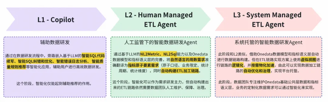 我们计划分3个阶段(L1~L3)建设Galaxy数据研发平台的智能化能力,来提升数据研发效率,降低业务自主进行数据研发的门槛,实现公司内部不同部门和岗位间的“数据平权”。如下所示: