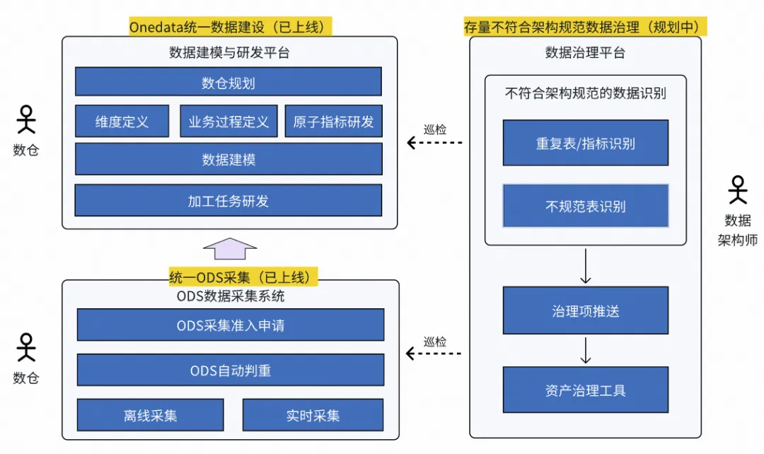 目前我们已在数据采集入仓和数据研发两个环节完成了数据架构能力建设,确保数据的入口(ODS)以及数据仓库的规范性,并再后续通过旁路数据治理的手段进行存量数据的规范化。如下图所示: