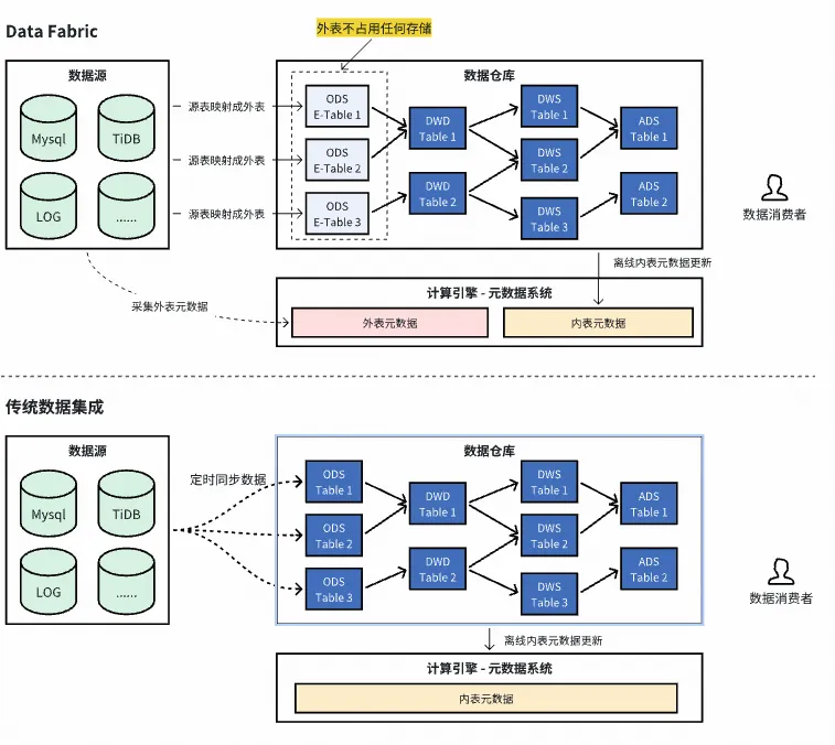 Data Fabric(数据编织)是一种全新的数据集成架构方案,核心理念是 “不移动数据,移动计算”。 技术实现方案上以外表的形式来封装源端表,通过统一的元数据系统,将源端表(外表)和离线表(内表)统一管理起来,使用起来对用户无感。在执行计算时,通过Spark引擎的跨源联邦查询能力,直接从各源端数据库(一般为备库或抽数库)将数据查询回来后进行分布式计算。下图展示了Data Fabric与传统数据集成的区别: